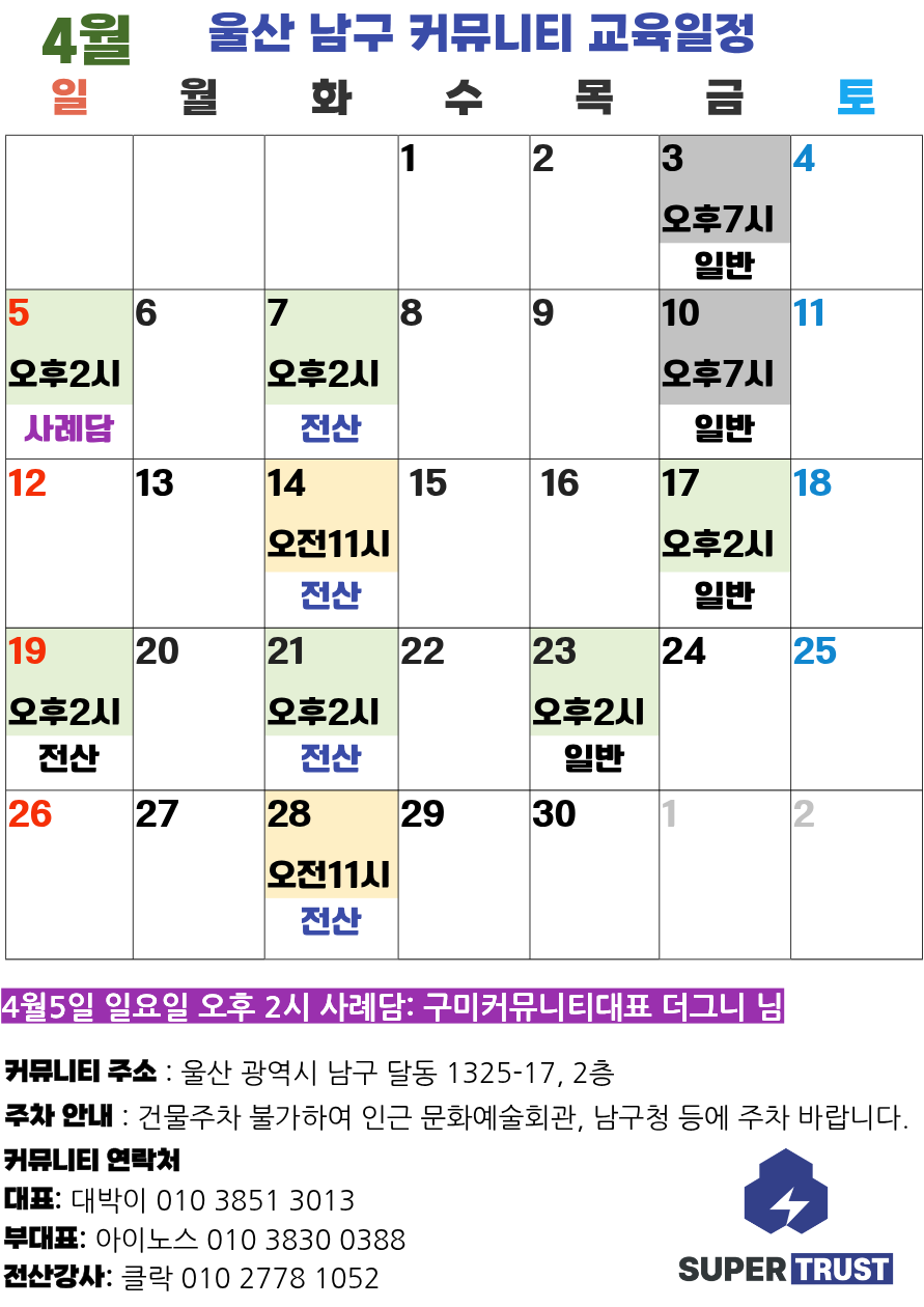 울산 남구 커뮤니티의 월별 강의를 이미지로 확인하실 수 있습니다.